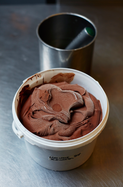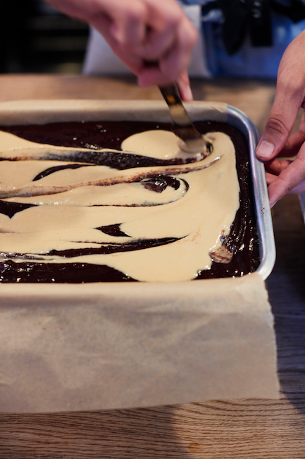 • Black tote bag with printed designs, small boxes, and a red ribbon on a white background