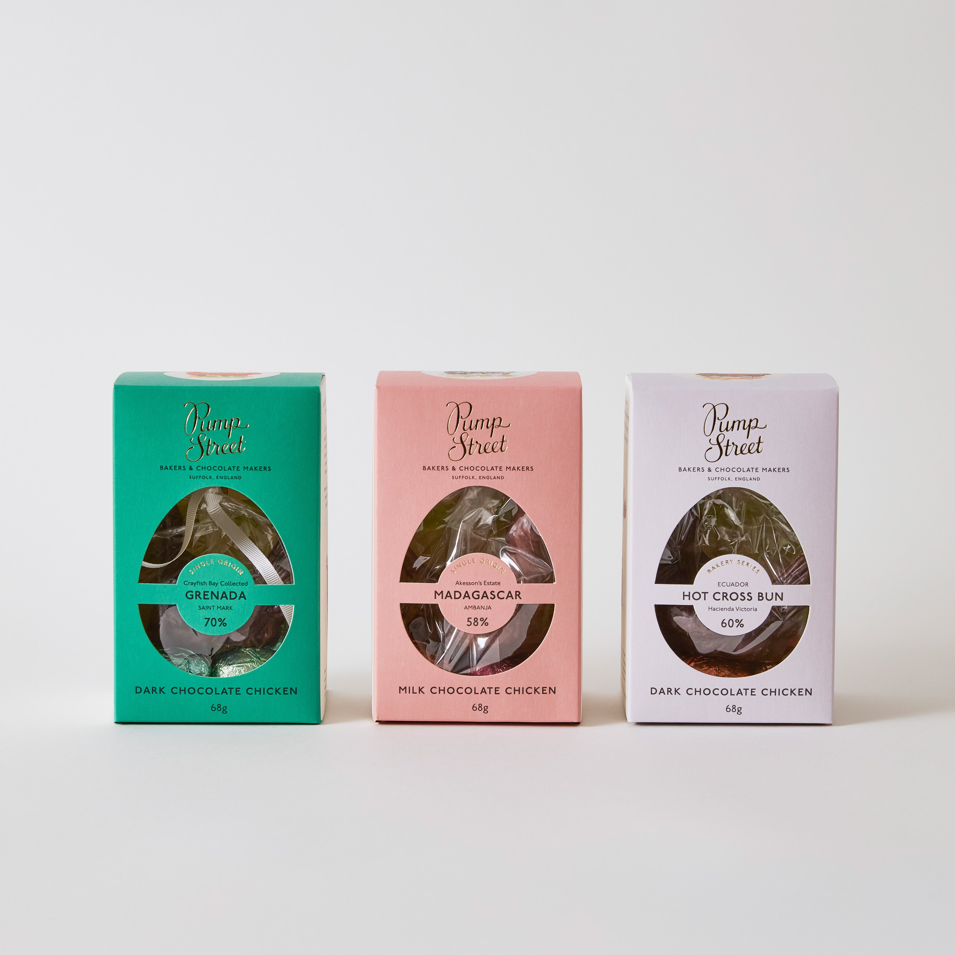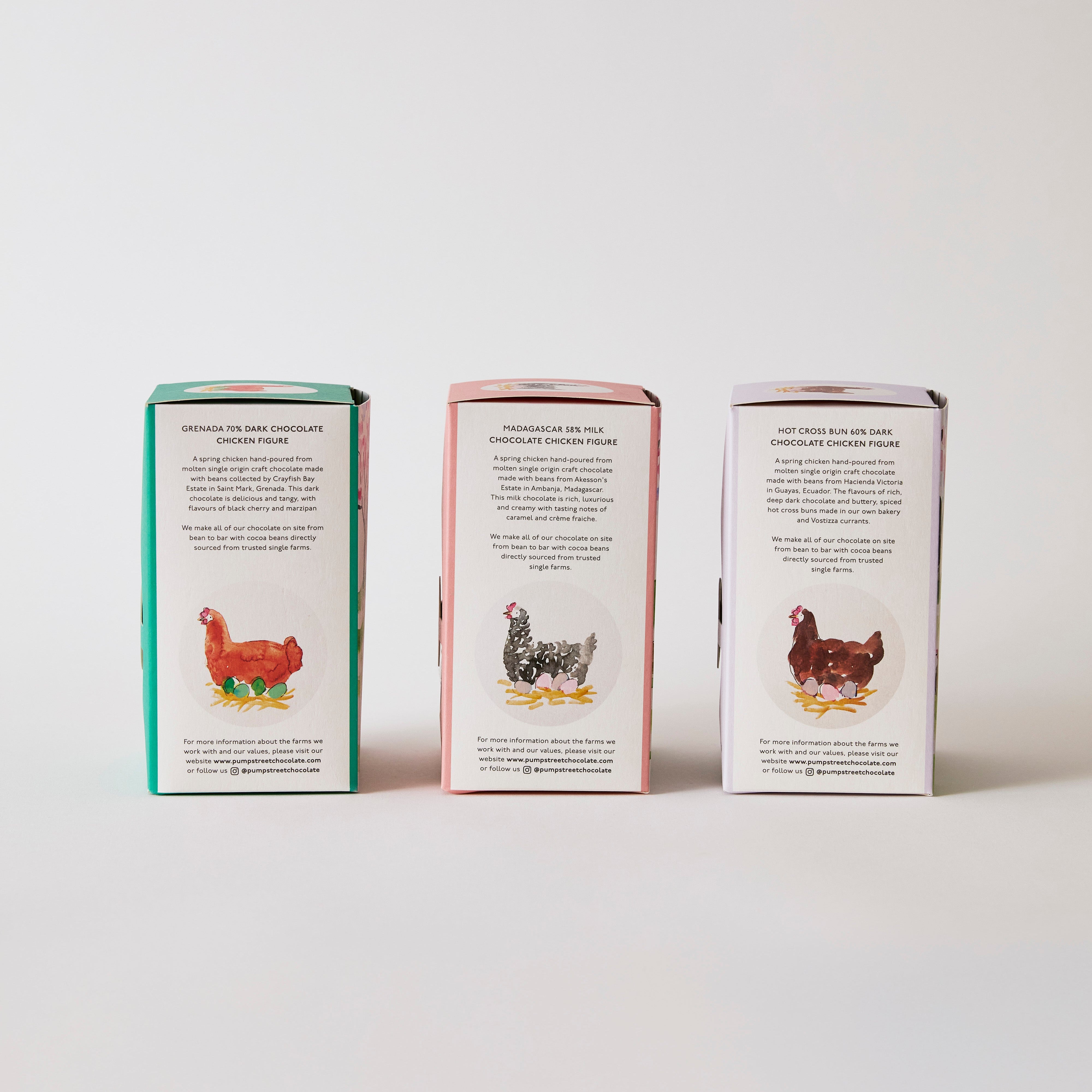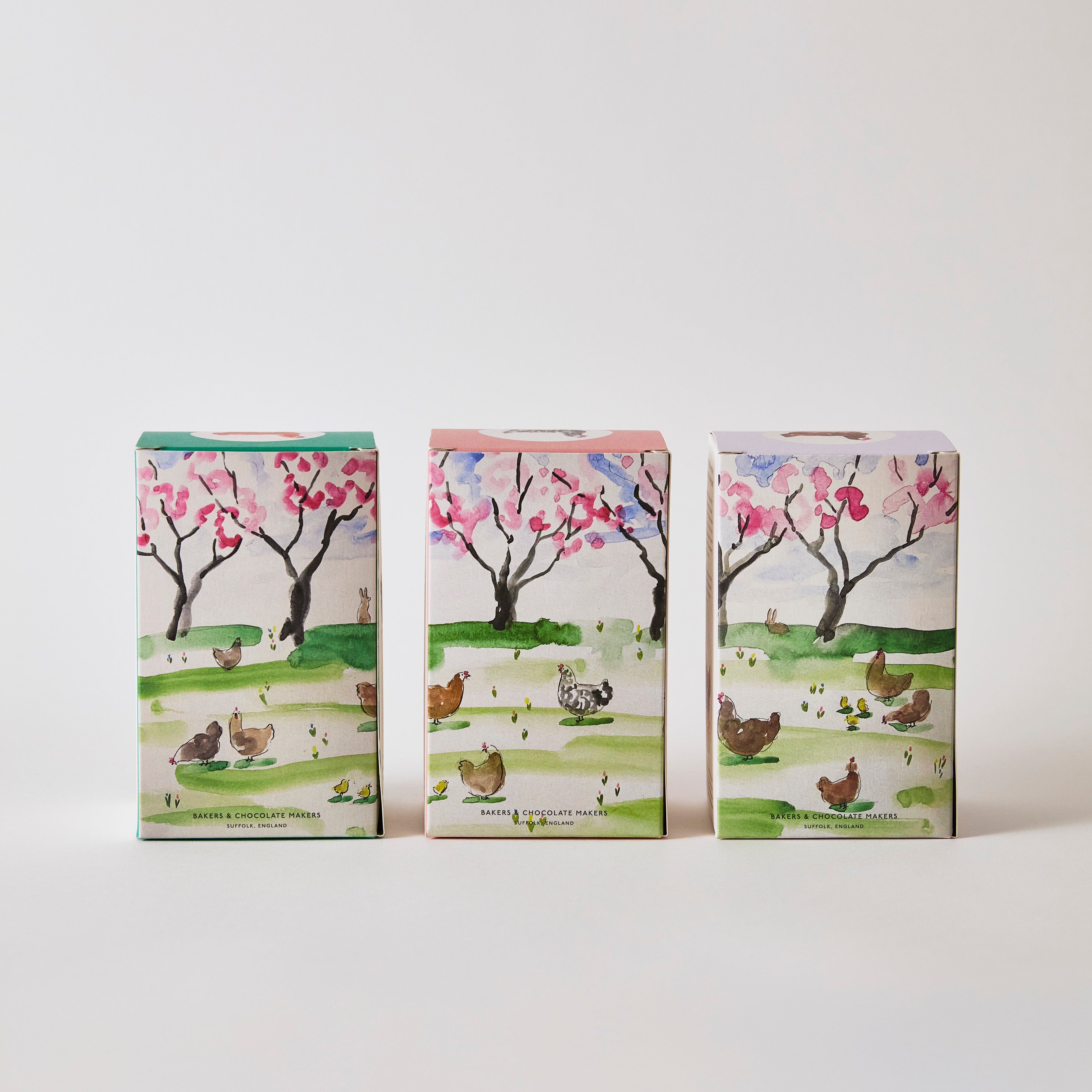 A beautiful trio of illustrated boxes filled with a signature single origin chocolate in the form of a hollow chicken and foiled eggs. This trio makes the perfect alternative to a traditional Easter egg.