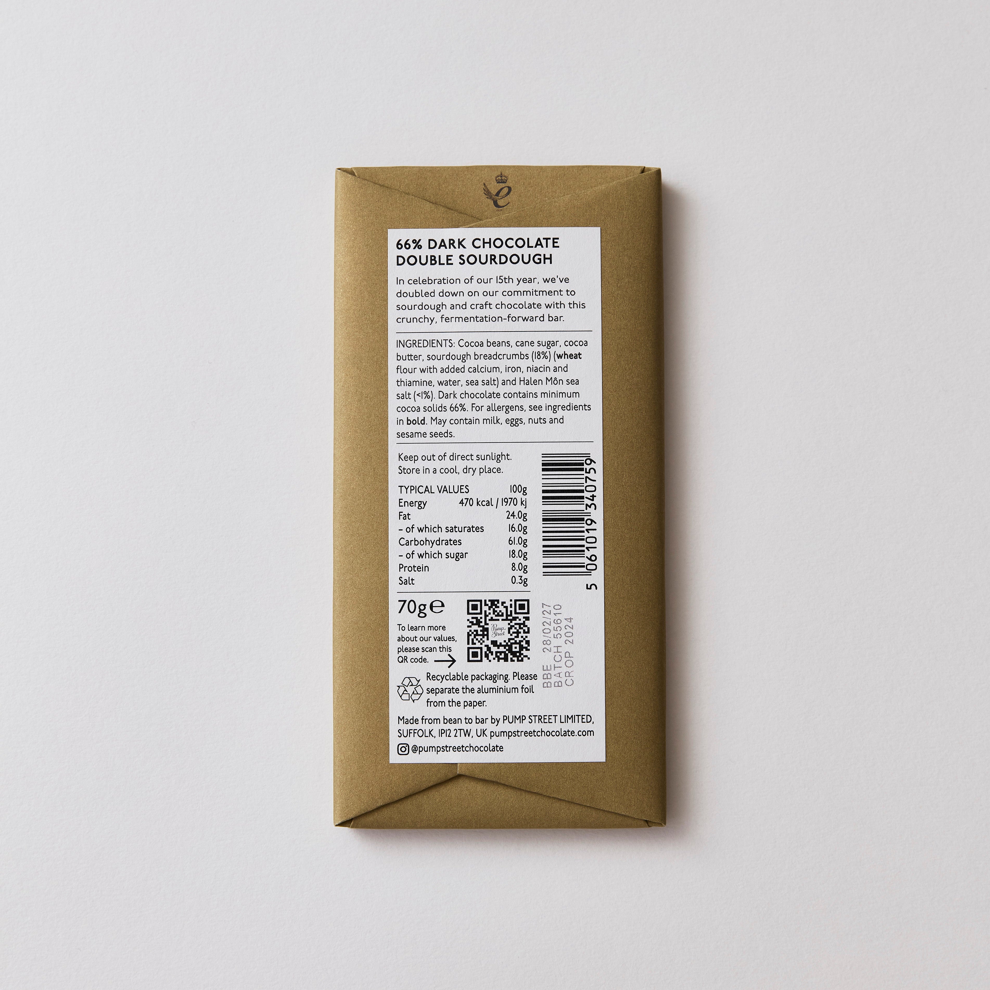 Double the crumb of our core Sourdough and Sea Salt bar, our Double Sourdough has satisfying crisp texture and complex taste.This bar is limited edition with each one hand numbered from 1-1500 by our co-founder Joanna Brennan.