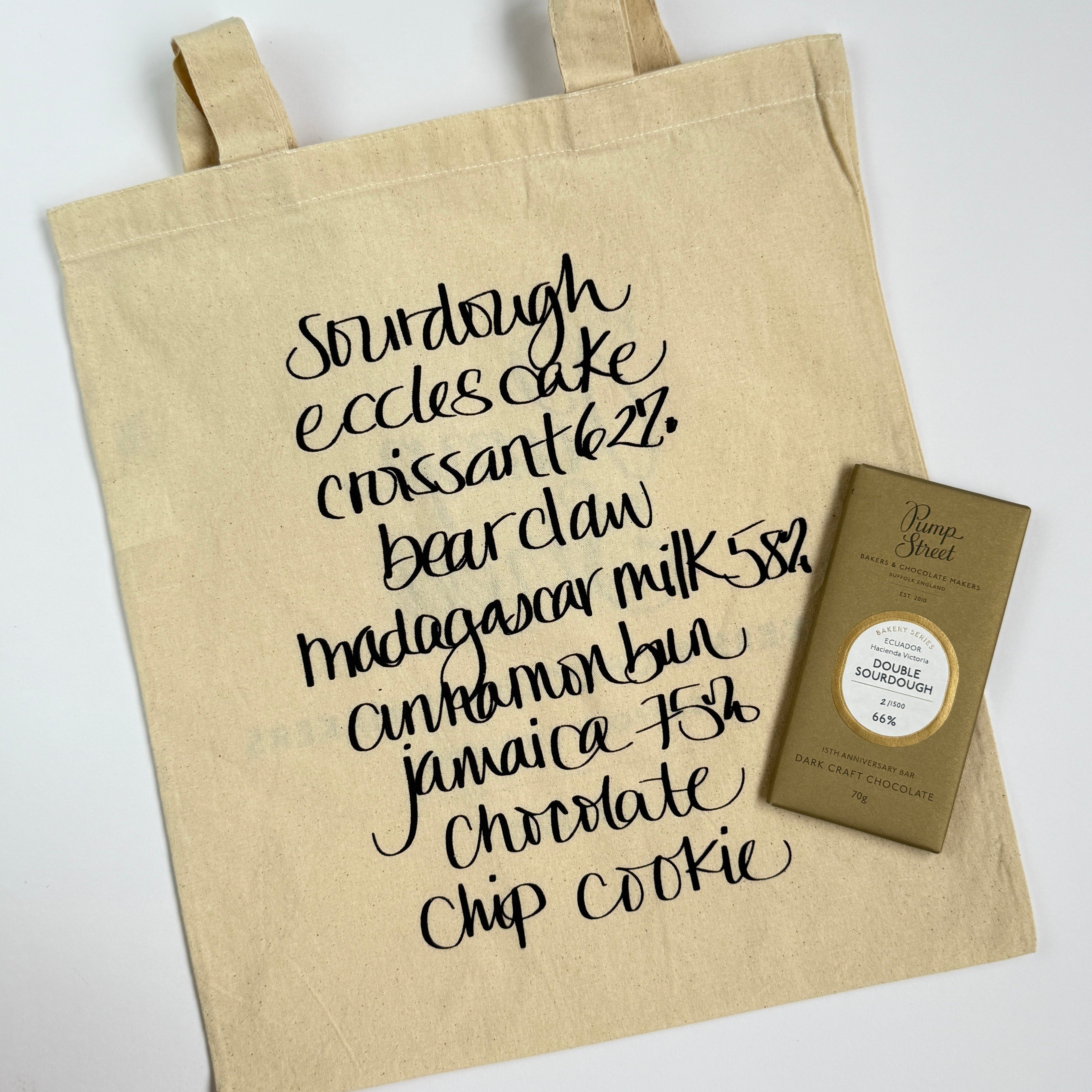 A nod to the products that make us Pump Street. The tote bag displays our 15 Year Anniversary logo featuring our EST. 2010 alongside the reverse motif of some of our most popular Bakery and Chocolate products, handwritten by co-founder, Joanna Brennan.