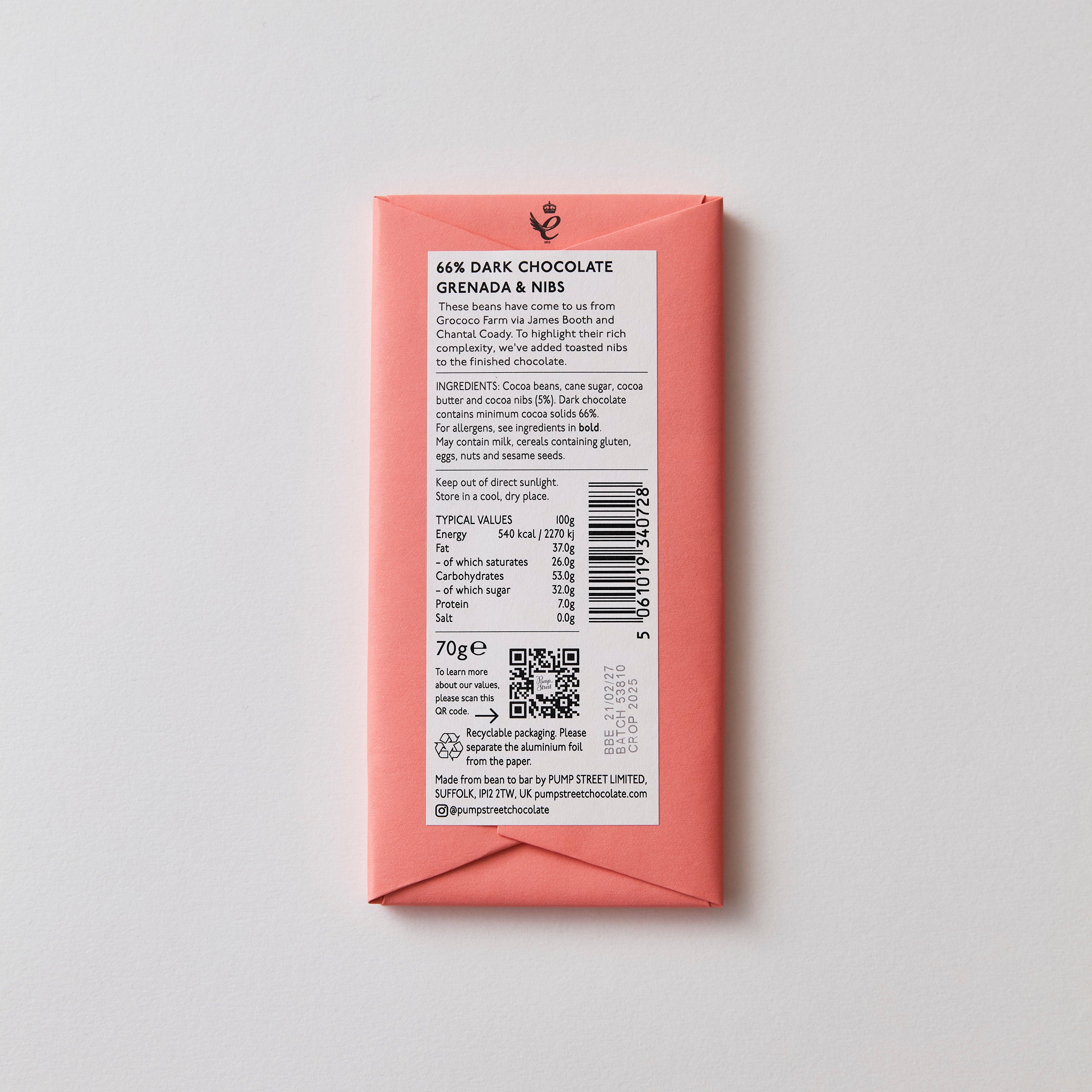 Made with beans sourced via Chantal Coady and James Booth’s smallholding, Grococo, in St. Patrick’s Parish, this chocolate offers a smooth, rich dark base with notes of blackcurrant, hot cocoa, and a gentle hint of tobacco. Cocoa nibs are scattered throughout for a tender, piquant crunch that enhances both texture and flavour.